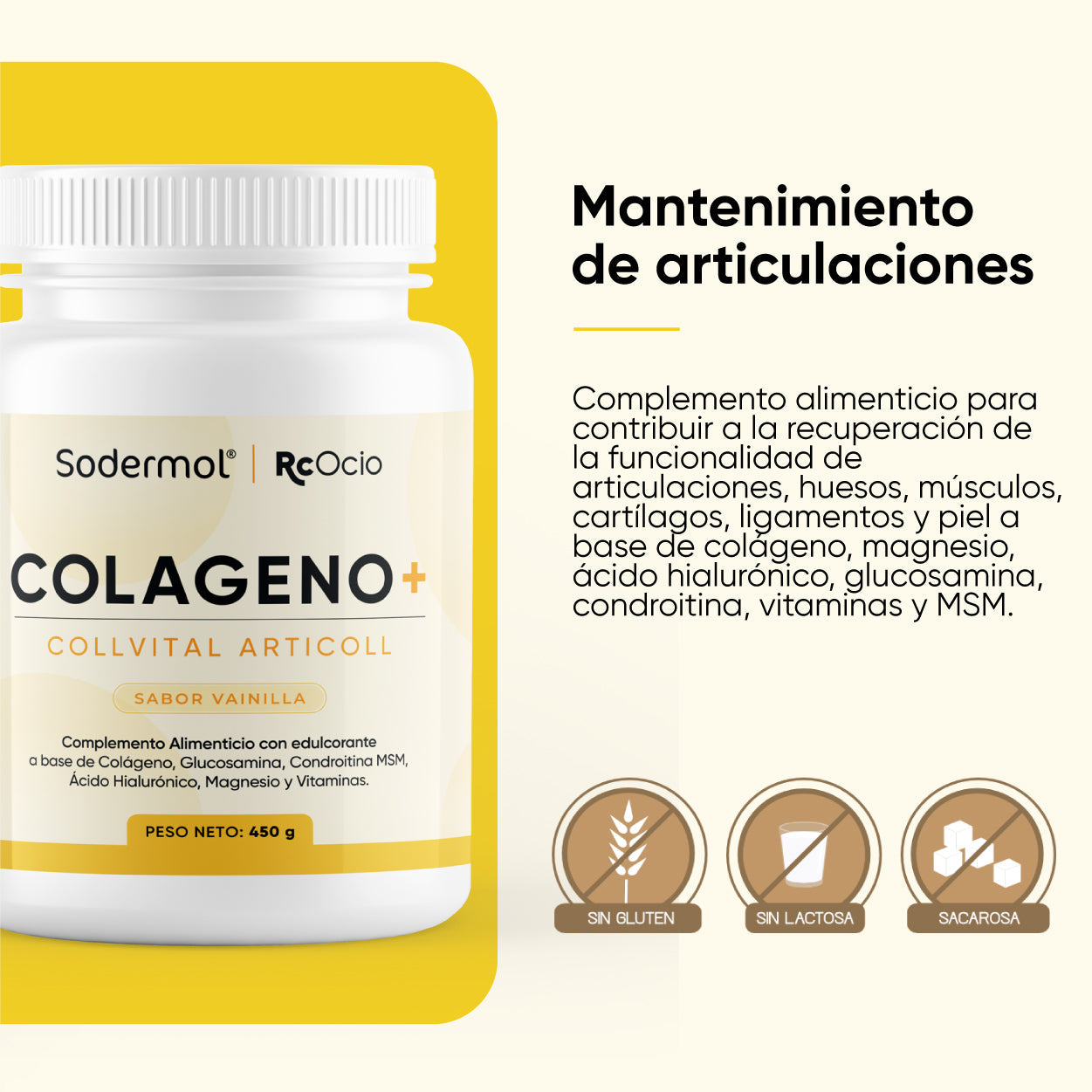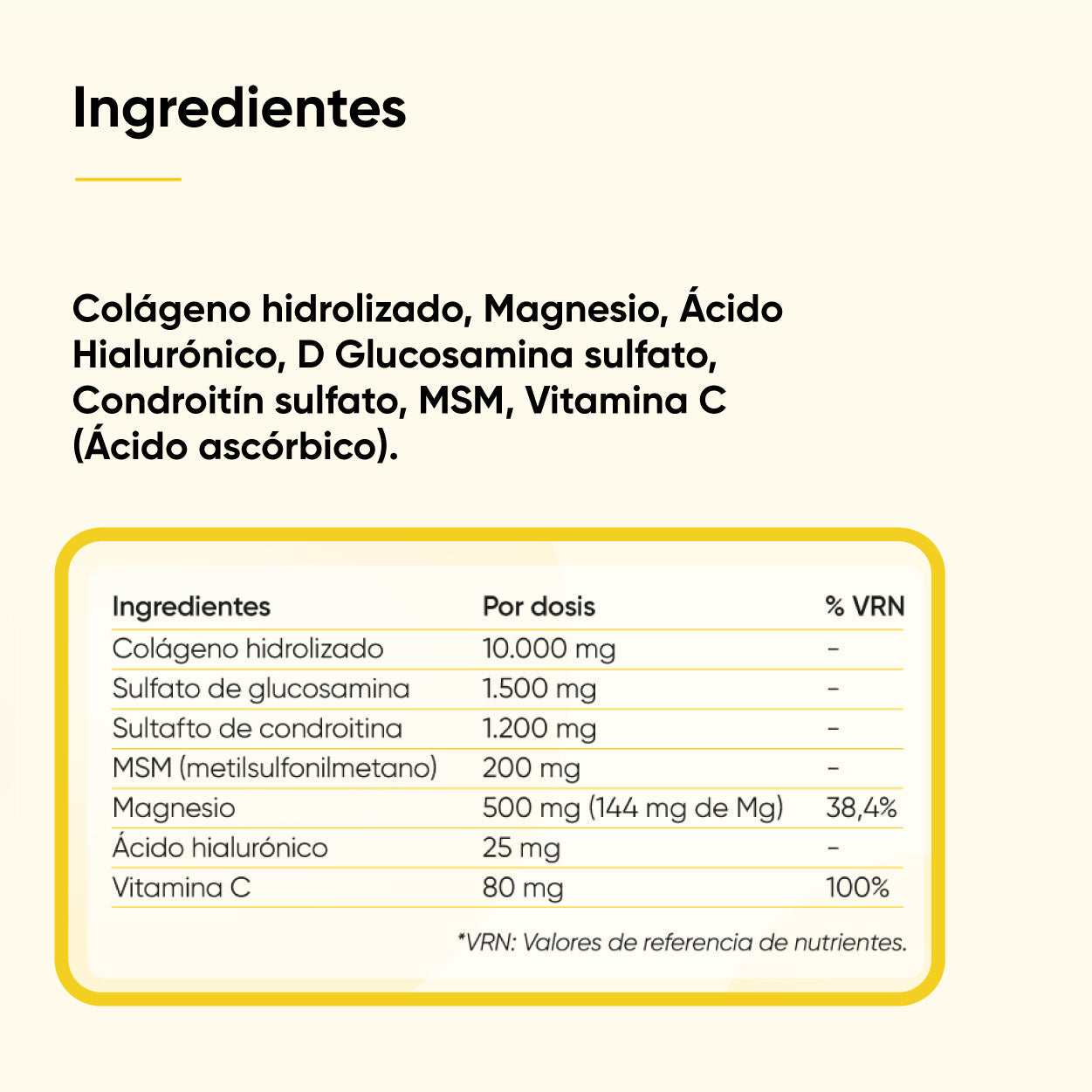 Ingredientes: Colágeno hidrolizado, sulfato de glucosa-mina (2) KCI (fuente de crustáceos), sulfato de condroitina, maltodextrina, aroma de vainilla, carbonato de magnesio, MSM (Metilsulfonilmetano), ácido L-ascórbico (Vitamina C), ácido hialurónico, acidulante (ácido cítrico), edulcorante (sucralosa).