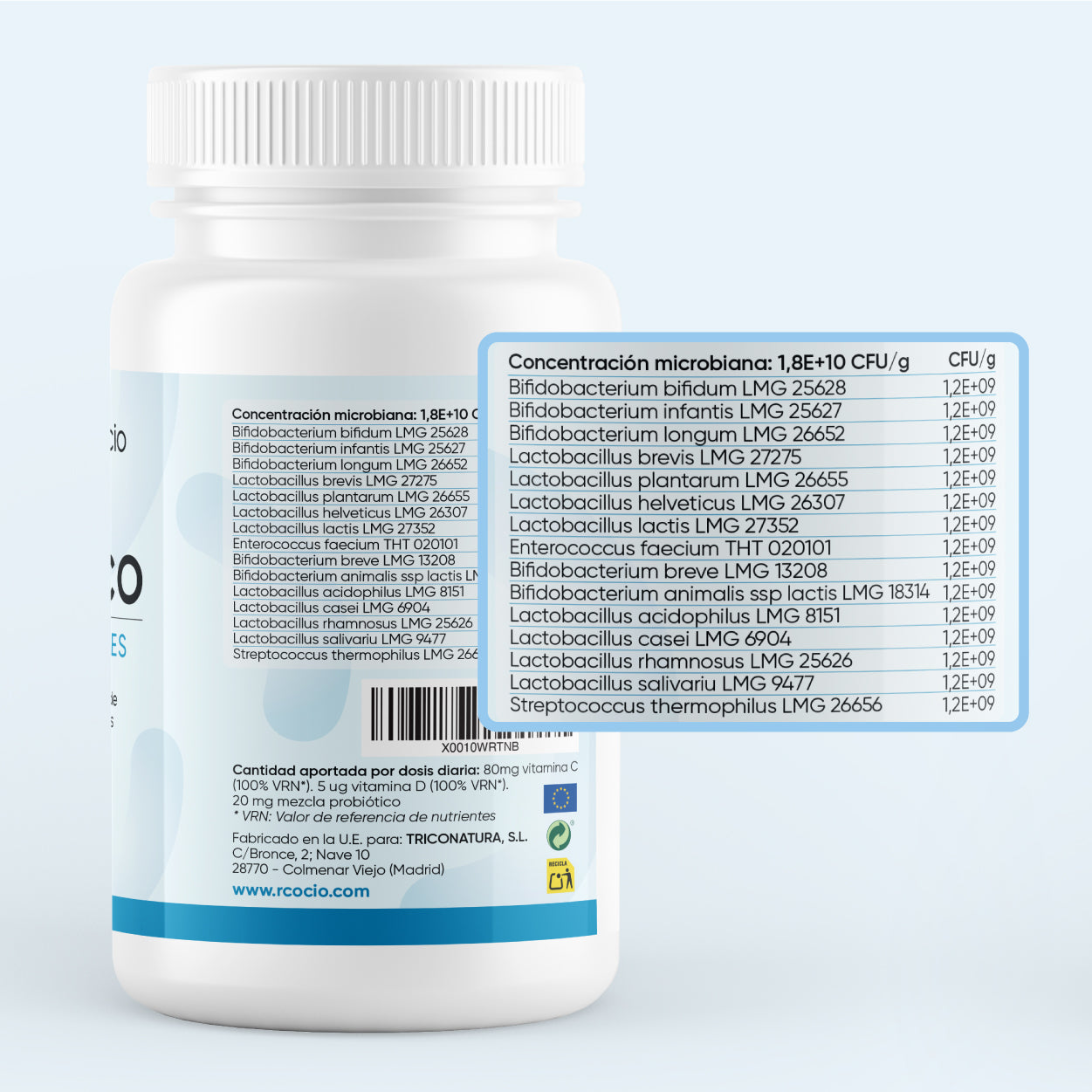 Nuestro probiótico es una combinación altamente efectiva de 15 cepas probióticas, junto con vitamina D3 y vitamina C, diseñado para mejorar tu salud intestinal y proteger tu sistema inmunológico. Cada cápsula está formulada con la máxima rigurosidad, para dar a nuestros clientes un producto premium que les ayude a sentirse mejor y vivir una vida más saludable.