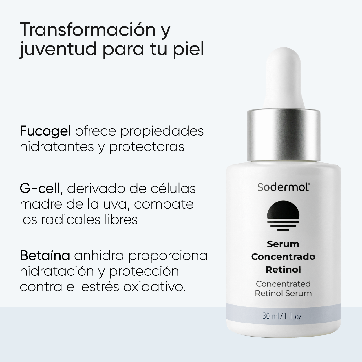 El Serum Noche Retinol de Sodermol es una solución antienvejecimiento de vanguardia, formulada para revitalizar y rejuvenecer la piel. Con un 0.3% de Retinol puro, este serum penetra profundamente para reducir los signos visibles del envejecimiento, como arrugas, líneas de expresión y manchas. La Niacinamida (vitamina B3) estimula la síntesis de colágeno y mejora la barrera de la piel, mientras que Fucogel ofrece propiedades hidratantes y protectoras. G-cell, derivado de células madre de la uva, combate los radicales libres, y la Betaína anhidra proporciona hidratación y protección contra el estrés oxidativo. Además, el activo botox-like de Acmella Olerácea reduce las micro-contracciones faciales, suavizando las arrugas. Este serum representa una de las fórmulas más completas del mercado, superando a otros productos que solo contienen retinol.