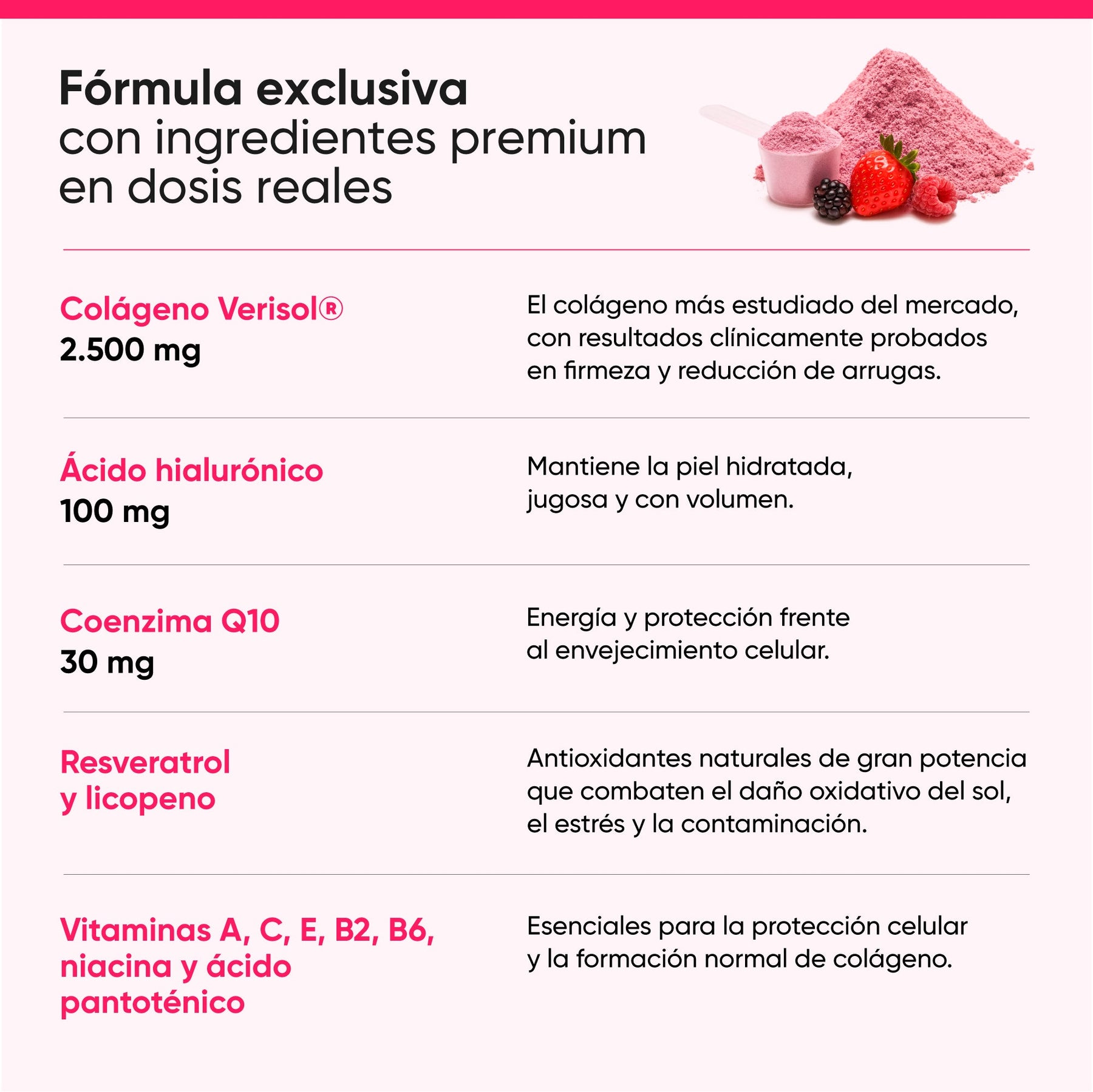 • Colágeno Verisol® (2.500 mg): el colágeno más estudiado del mercado, con resultados clínicamente probados en firmeza y reducción de arrugas.