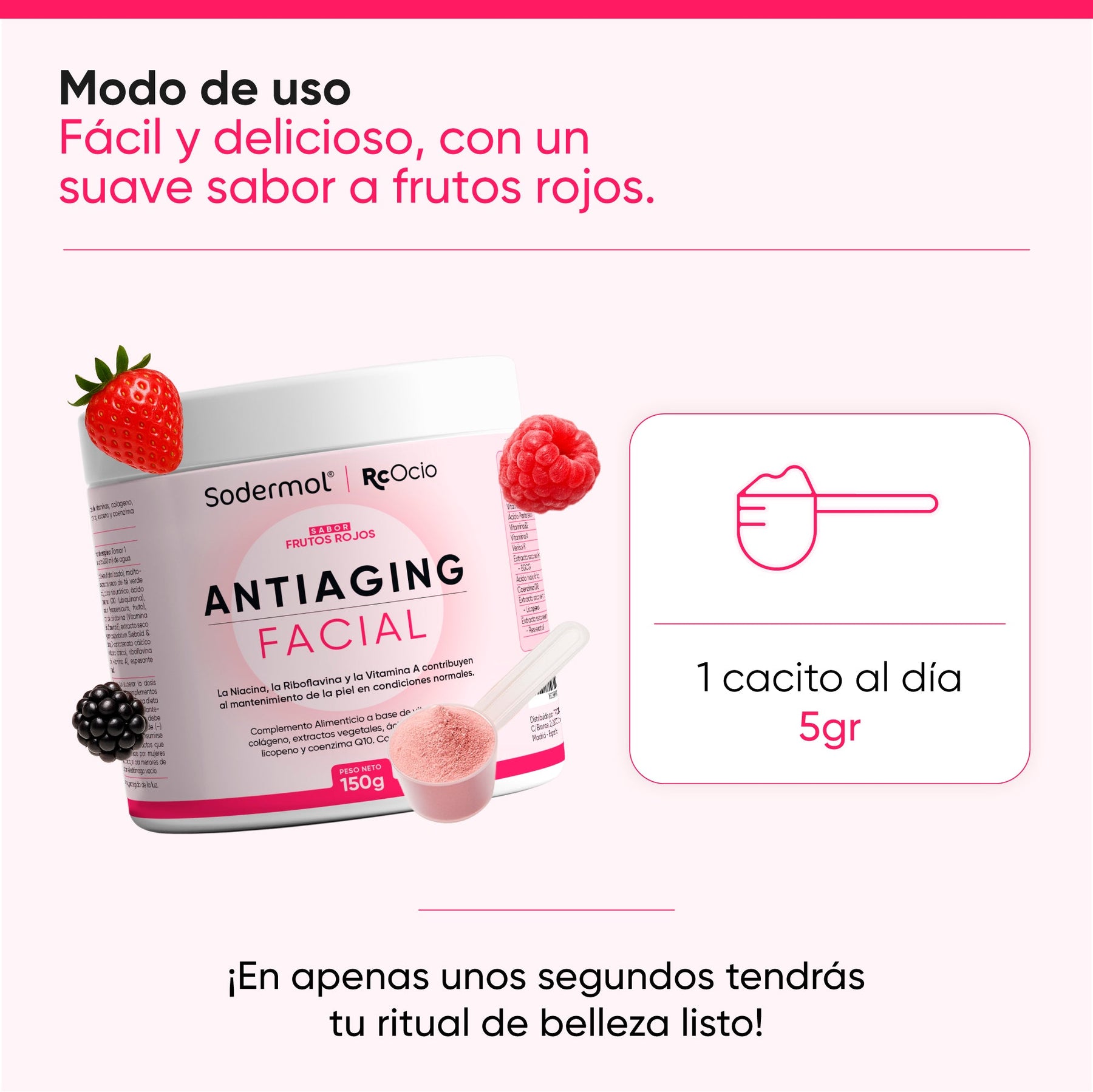 1 cacito al día (5 g), con un suave sabor a frutos rojos. En apenas unos segundos tendrás tu ritual de belleza listo.
